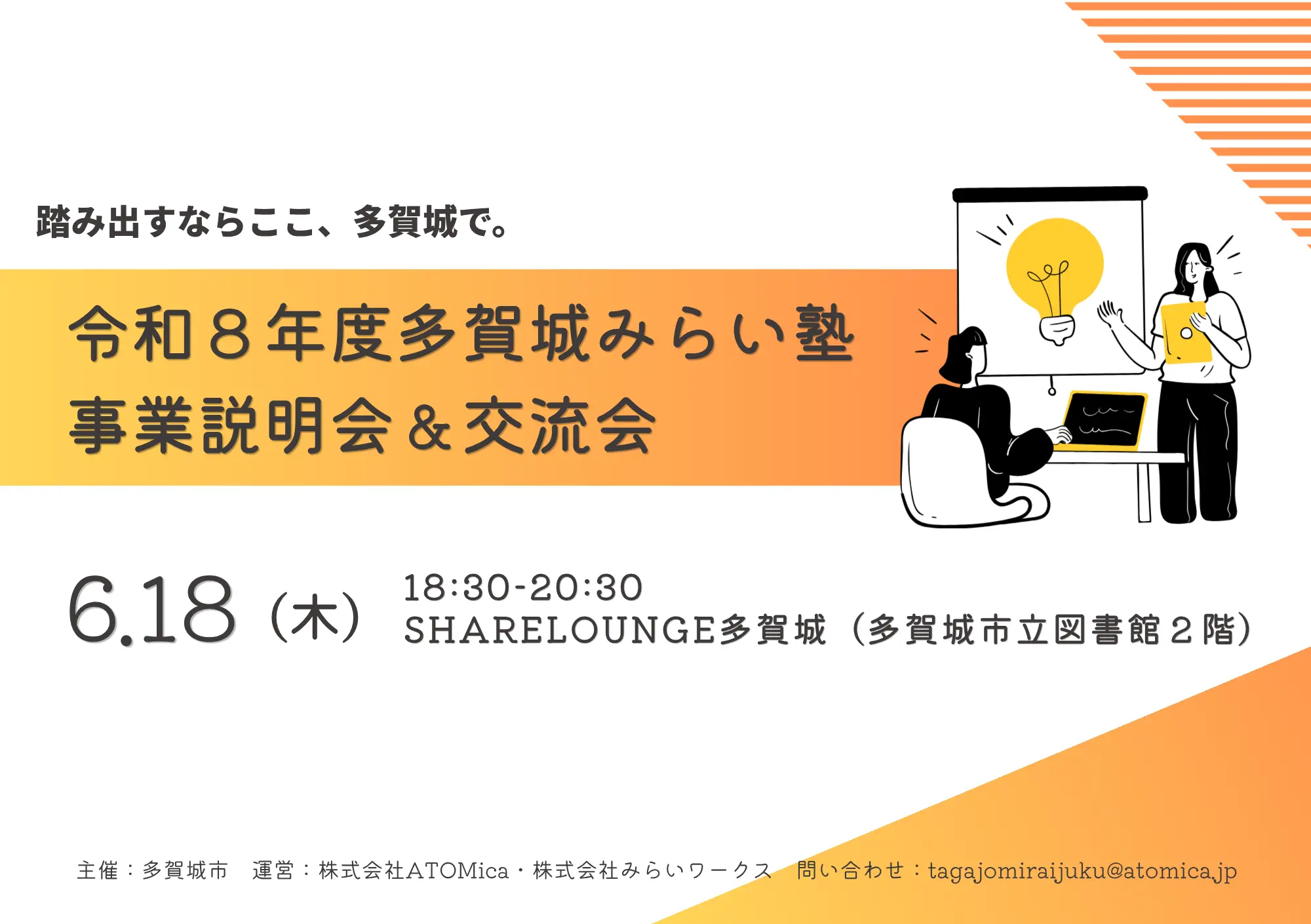 令和8年度多賀城みらい塾の本格的な始動に先立って、今年度事業の全体像をご紹介する事業説明会と、当日説明会にご参加いただいた皆さまとの交流会を実施いたします。