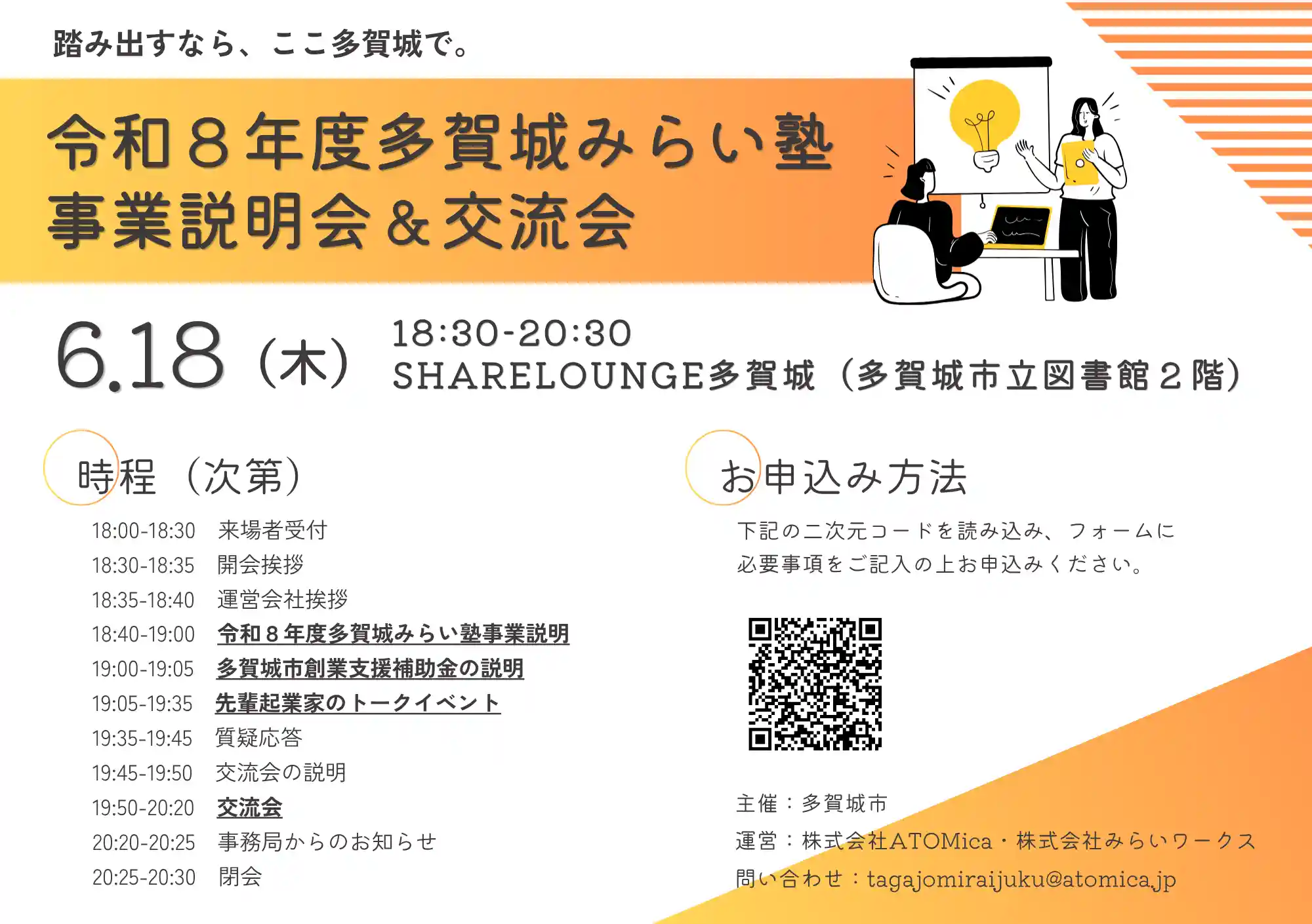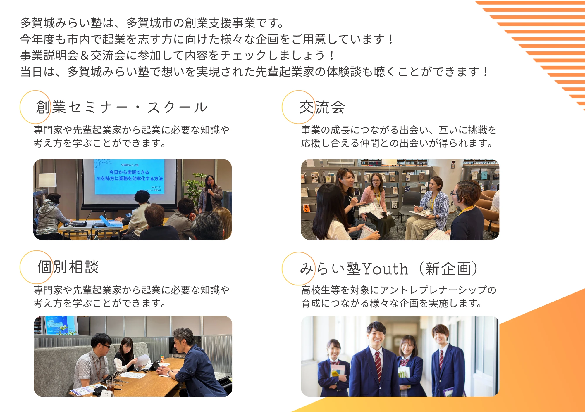事業説明会では、事業を運営する2社(株式会社みらいワークス、株式会社ATOMica)からのプログラム紹介ほか、過去の多賀城みらい塾を活用して起業された方の起業体験談紹介(トークイベント)、多賀城市の創業支援補助金のご紹介等も予定しております。