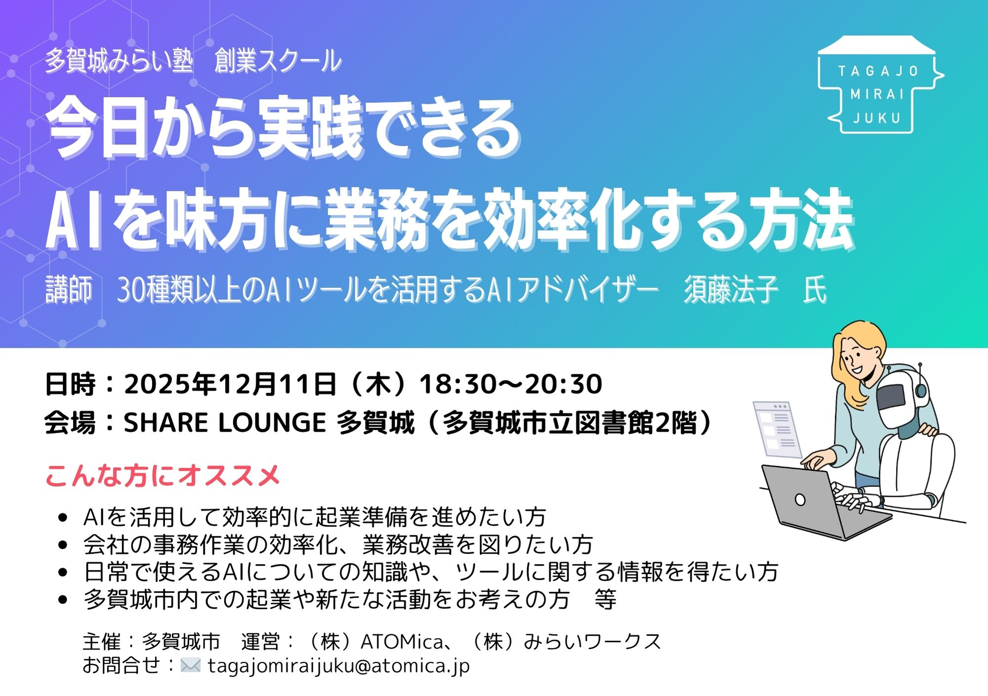 【お問合せ】株式会社ATOMica ✉ tagajomiraijuku@atomica.jp